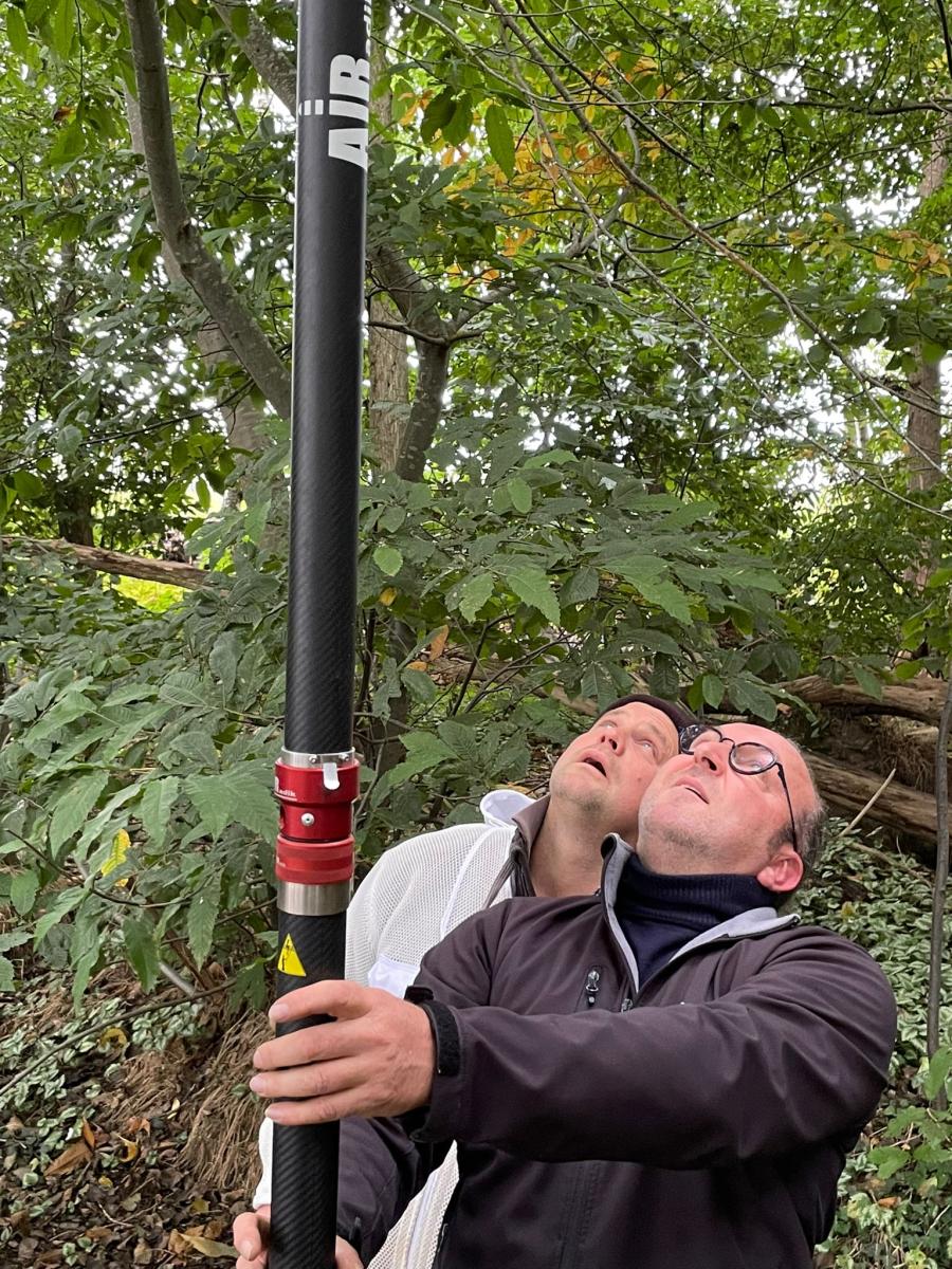Peter (links) met zijn schoonbroer Kris (rechts) aan het werk met de telescopische lans.