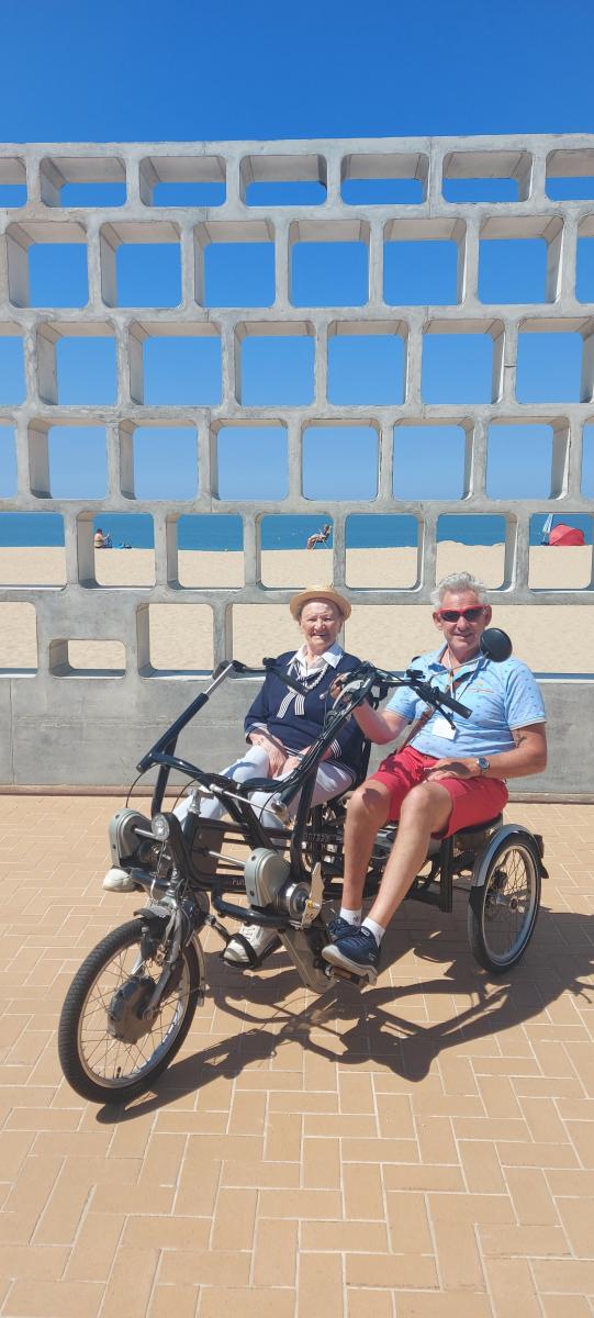 Niet meer zelf kunnen fietsen. Maar wel nog wind door je haar willen voelen. Het kan nog. Dankzij Dunecluze. Het woonzorgcentrum leent zijn elektrische duofiets uit aan Koksijdse senioren of mensen met een beperking.