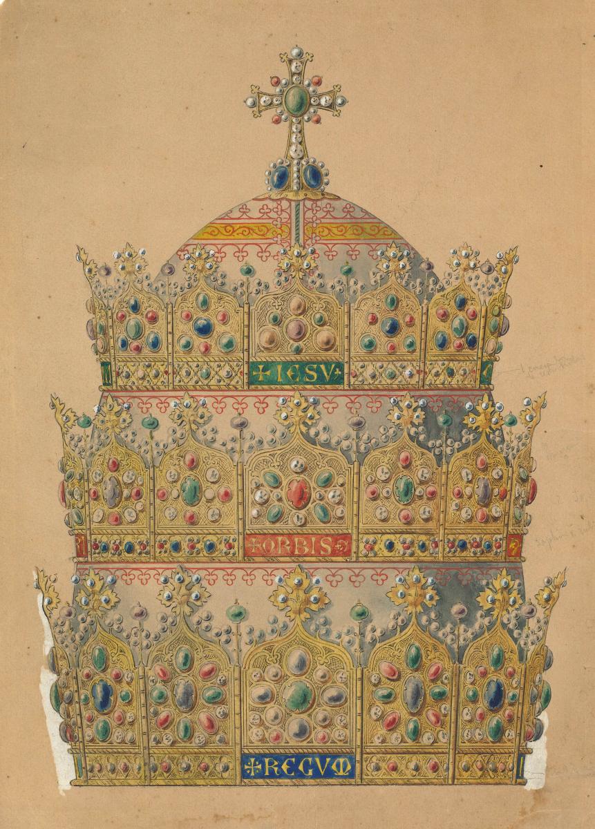 Eén van de meest opvallende verhalen uit die collectie leidt naar Rome. In 1871 ontwierp architect Jean-Baptiste Bethune een tiara voor paus Pius IX. De uitvoering lag in handen van Armand Bourdon. Het luxueuze hoofddeksel was een geschenk van de dames van het hof van koning Leopold II en koningin Maria Hendrika, naar aanleiding van het 25-jarige pontificaat van de paus.
