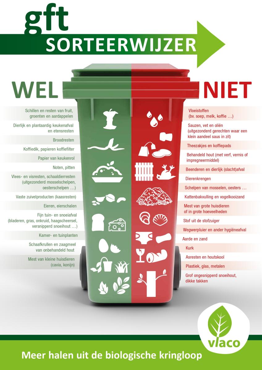 GFT is meer dan alleen groenten, fruit en tuinafval, ook etensresten, keukenafval en voedingsmiddelen zoals brood, eierschalen, charcuterie en deegwaren horen bij GFT.