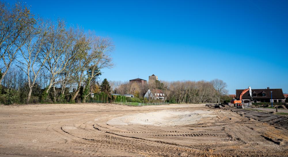 Achter de Sint-Niklaaskerk graven machines de grond af. 60 centimeter diep. Op een oppervlakte van 2,5 hectare.