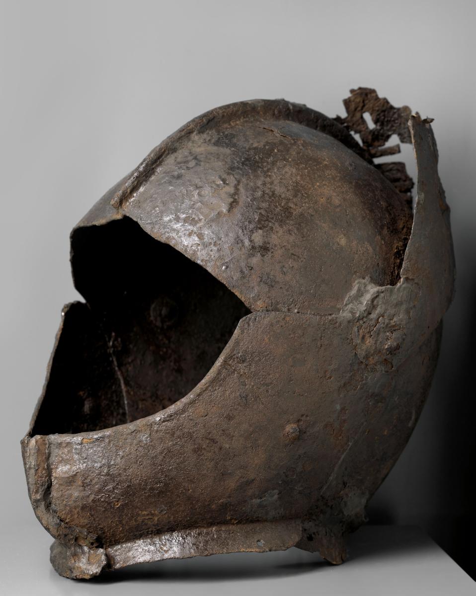 Gevonden op de bodem van een vijver en bijna volledig intact: een metalen helm met kinstuk en vizier. Uit de 15e-17e eeuw. Van wie was hij? Een gast van de abdij of een soldaat die er kampeerde? Het mysterie maakt de helm alleen maar specialer.